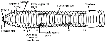 5. Refer again to the diagram of the ventral view of the worm to locate and identify the external parts of its reproductive system. Find the pair of sperm grooves that extend from the clitellum to about segment 15, where one pair of male genital pores is located. Look also for one pair of female genital pores on segment 14. There is another pair of male genital pores on about segment 26. Try to find the two pairs of openings of the seminal receptacles on segment 10. Note: These openings are not easy to see.