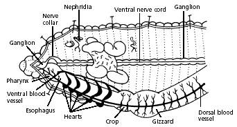 7. Use the diagram below to locate and identify the five pairs of aortic arches, or hearts. Then find the dorsal blood vessel. Look for smaller blood vessels that branch from the dorsal blood vessel. ***On your internal Diagram worksheet add the functions of the following internal organs.