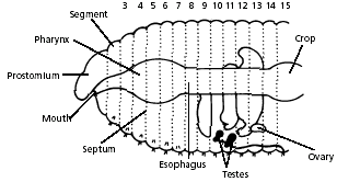11. Use the diagram below to locate and identify a pair of ovaries in segment 13. Look for two pairs of tiny testes in segments 10 and 11. To find these organs, you will again have to push aside some parts already dissected.